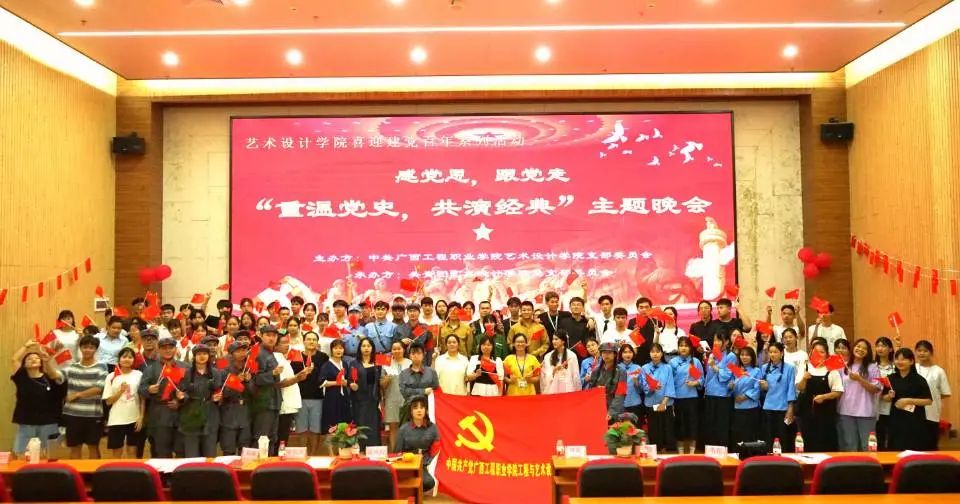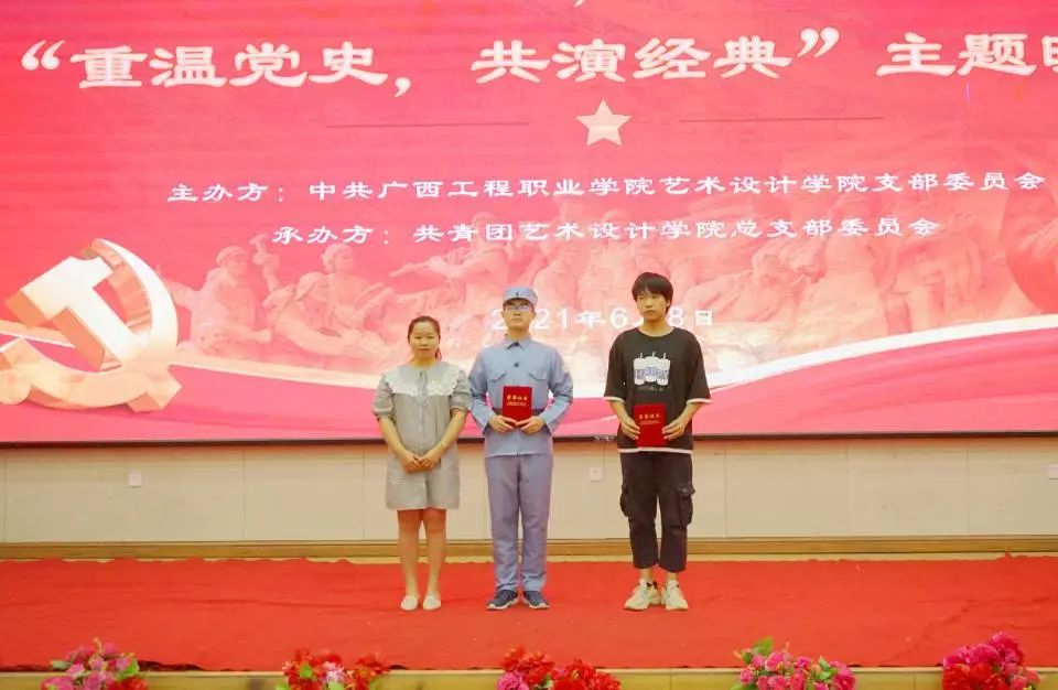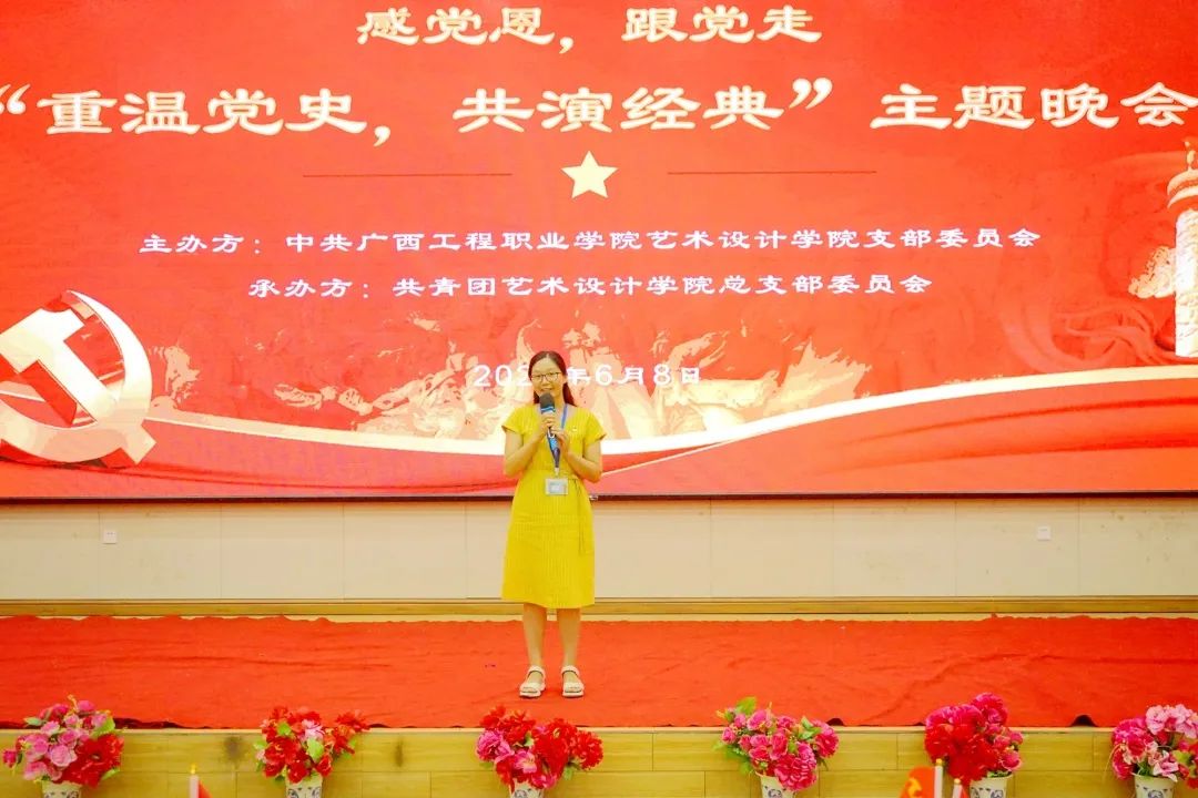 2021年6月8日晚,藝術(shù)設(shè)計(jì)學(xué)院在圖文信息大樓一樓學(xué)術(shù)報告廳舉辦了聽黨話、感黨恩、跟黨走——“重溫黨史,共演經(jīng)典”主題晚會。出席晚會現(xiàn)場的領(lǐng)導(dǎo)有學(xué)校副校長林萌,藝術(shù)設(shè)計(jì)學(xué)院黨支部書記、副院長覃鳳姣,黨支部委員陸閑,黨支部委員、辦公室主任王艷,分團(tuán)委書記潘翠萍,教研室主任李花,黨支部全體師生黨員、黨員發(fā)展對象、入黨積極分子等也觀看了本次晚會。