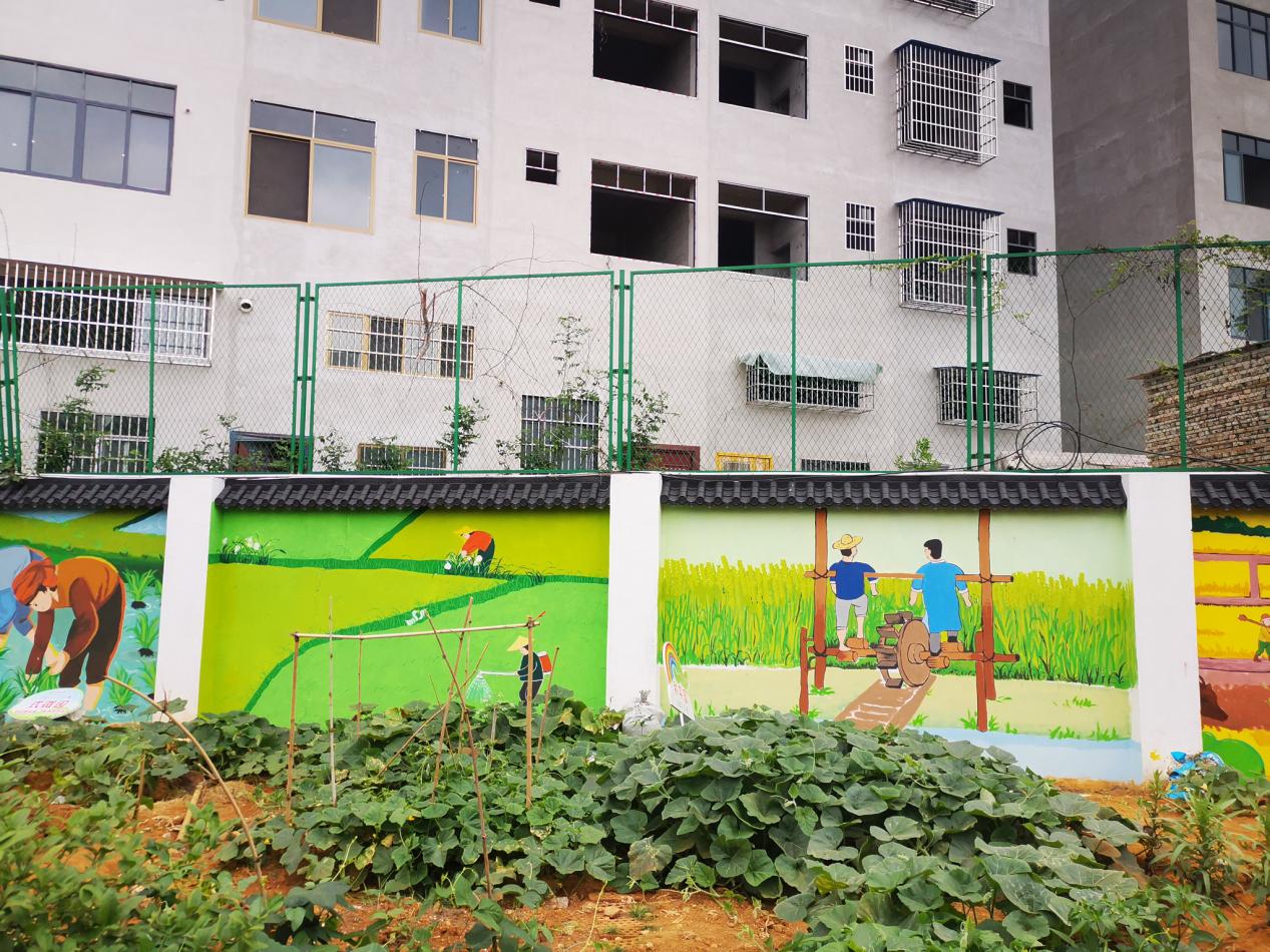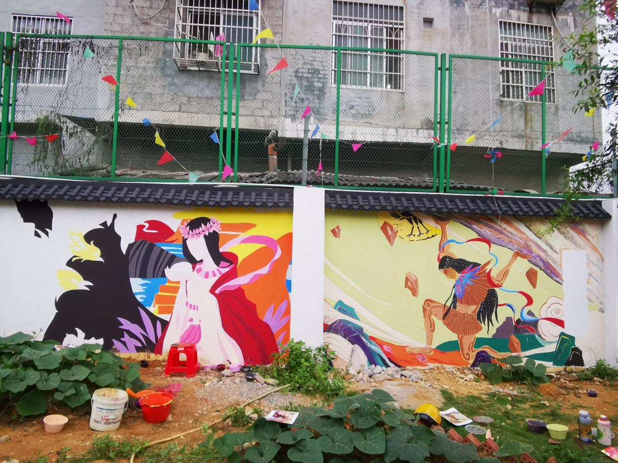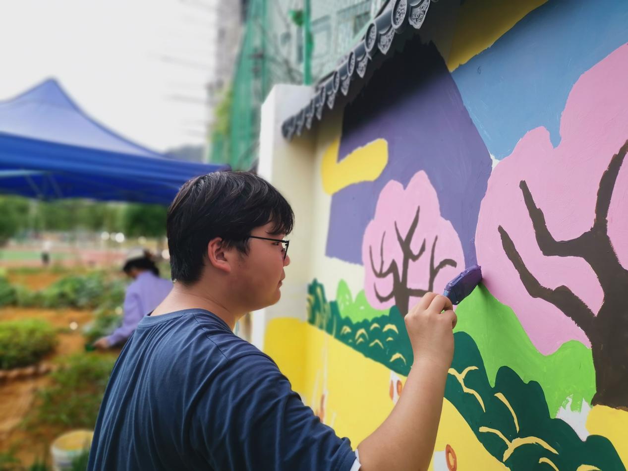 從紙上的設(shè)計,到具體在石灰白墻上展現(xiàn)出來,是一個從無到有、克服困難的過程。學生用自己的耐心、熱情和堅持完成了這一任務(wù),取得了良好效果。同學們保持戰(zhàn)斗熱情,勾線起稿、立面粉刷、精描線稿、調(diào)和顏色、上墻涂色,一筆一畫皆風景。