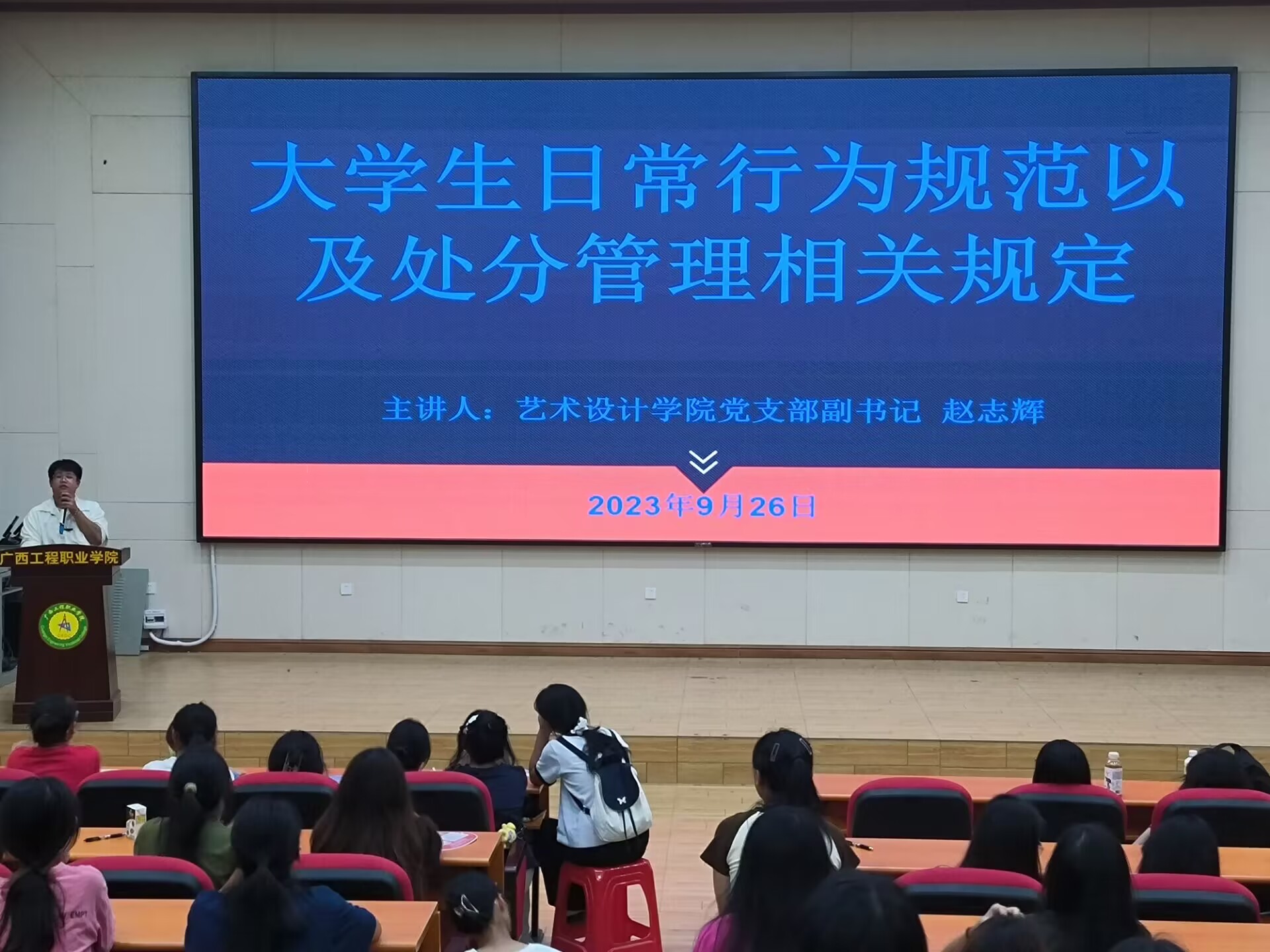 良好的生活習(xí)慣是確保順利、成功度過大學(xué)學(xué)習(xí)生涯的一個(gè)重要基礎(chǔ),為了讓使2023級(jí)新生的大學(xué)生活過得更加充實(shí)、美好,培養(yǎng)新生良好的生活習(xí)慣,2023年9月26日上午,藝術(shù)設(shè)計(jì)學(xué)院在學(xué)校圖文信息大樓學(xué)術(shù)報(bào)告廳開展了召“大學(xué)生日常行為規(guī)范以及處分管理相關(guān)規(guī)定”專題培訓(xùn),本場專題培訓(xùn)由學(xué)院黨支部副書記趙志輝主講,2023級(jí)全體新生參加了此次培訓(xùn)。