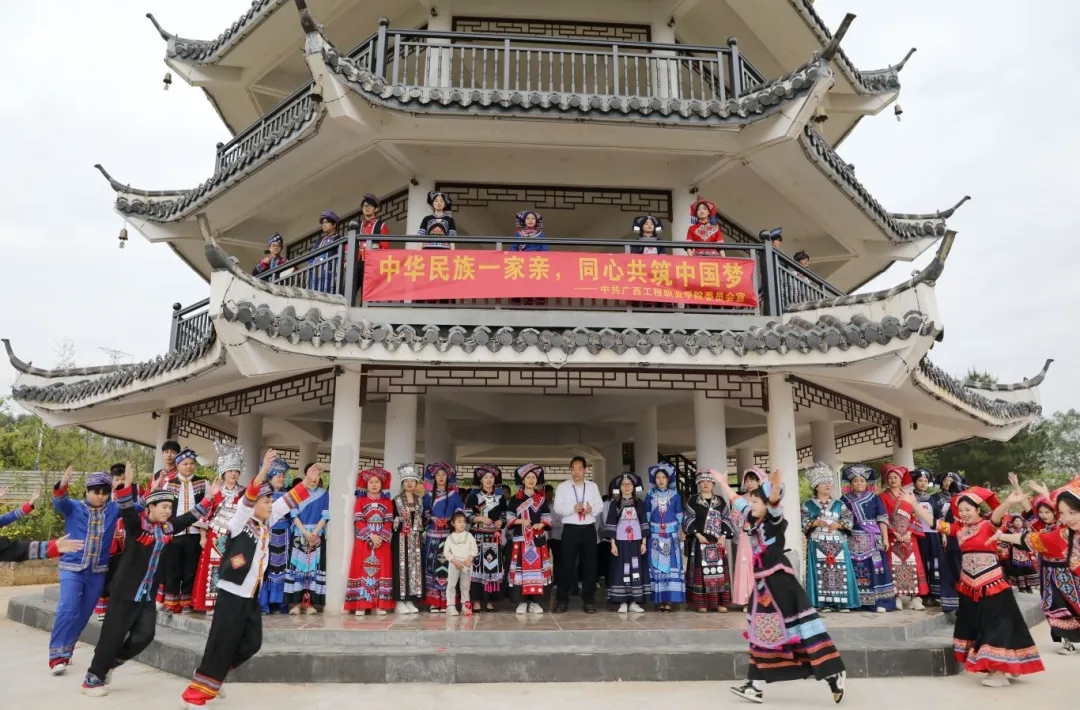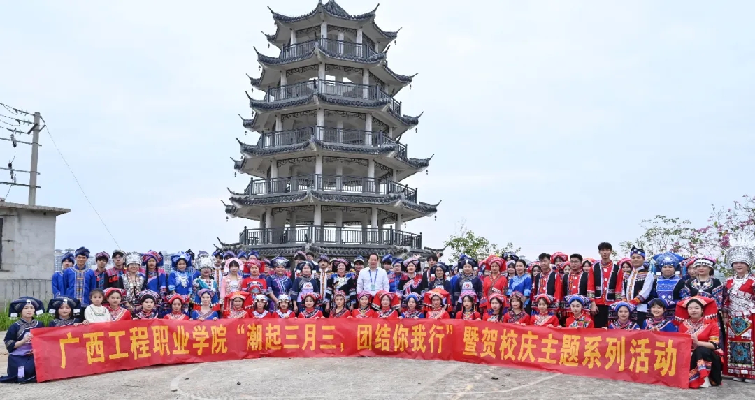4月9日,學校師生身穿民族服飾,相聚工程塔,唱山歌,拋繡球,感受多彩民族風情,同慶“廣西三月三”民族傳統(tǒng)節(jié)日。黨委書記、督導專員蒙本曼等校領導參加了活動。