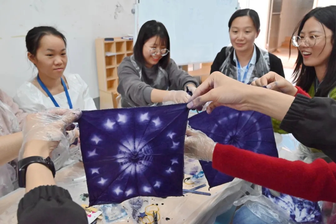 扎染工藝分為扎結和染色兩部分,學生們用紗線、皮筋將棉布捆扎成不同的花紋,浸入染料中,通過不同的著色、脫色,形成層次豐富、令人驚嘆的色暈和圖案。