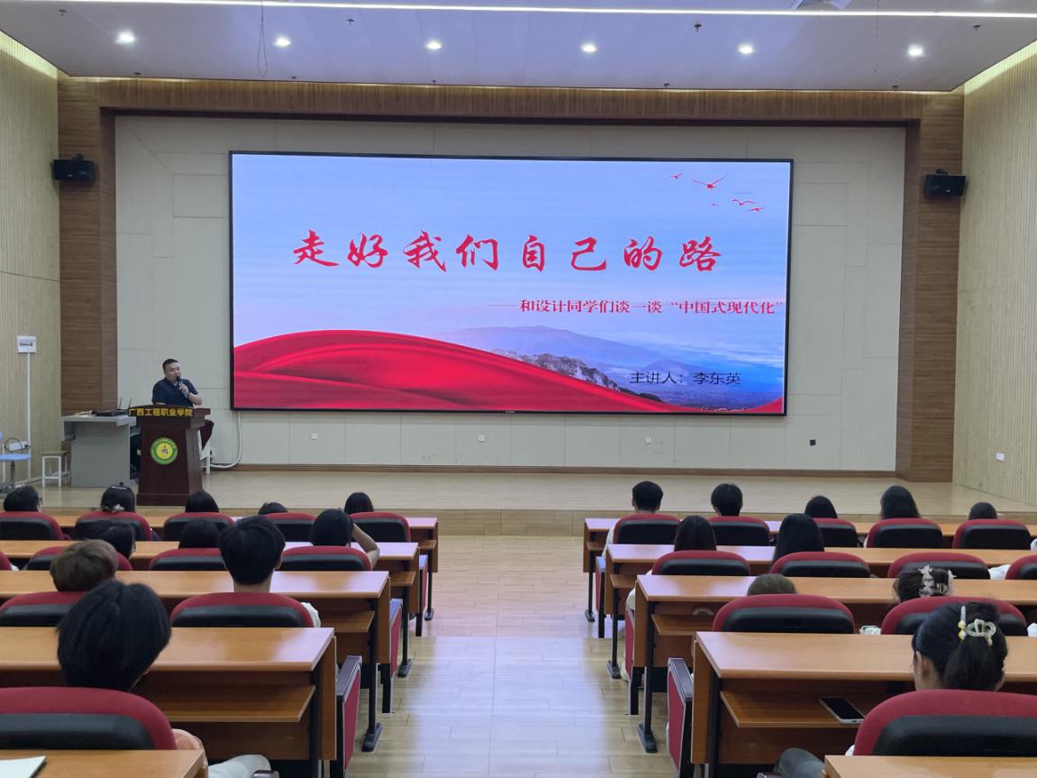 為深入學(xué)習(xí)領(lǐng)會習(xí)近平總書記關(guān)于中國式現(xiàn)代化道路的重要論述,2025年5月17日下午,廣西工程職業(yè)學(xué)院藝術(shù)設(shè)計(jì)學(xué)院分團(tuán)委開展“走好我們自己的路——和設(shè)計(jì)同學(xué)們談一談‘中國式現(xiàn)代化’”主題團(tuán)課宣講活動,本期團(tuán)課由學(xué)院分團(tuán)委書記李東英老師主講,藝術(shù)設(shè)計(jì)學(xué)院2023級、2024級全體團(tuán)員參加。