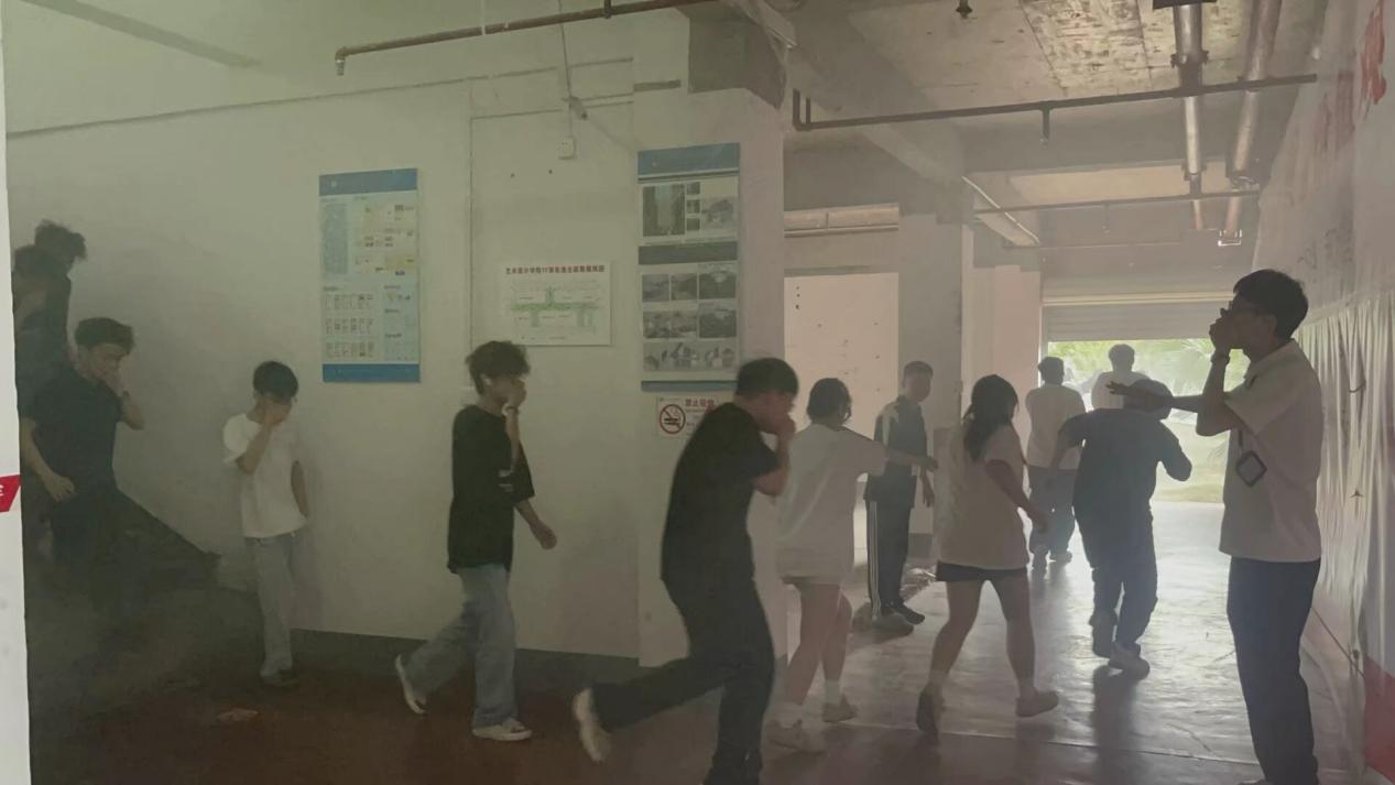 消防安全演練過程中,在藝術設計學院樓內(nèi)模擬火災場景,濃煙迅速彌漫,警報聲隨即響起。參與演練的師生迅速反應,按照應急預案,任課老師組織同學們用手捂住口鼻,采取低姿勢快速前進,在安全出口處教師的引導下沿指定疏散路線有序撤離。在短短一分鐘內(nèi),全體師生安全撤離至學院門口的安全地帶,展現(xiàn)了高效的應急反應能力。