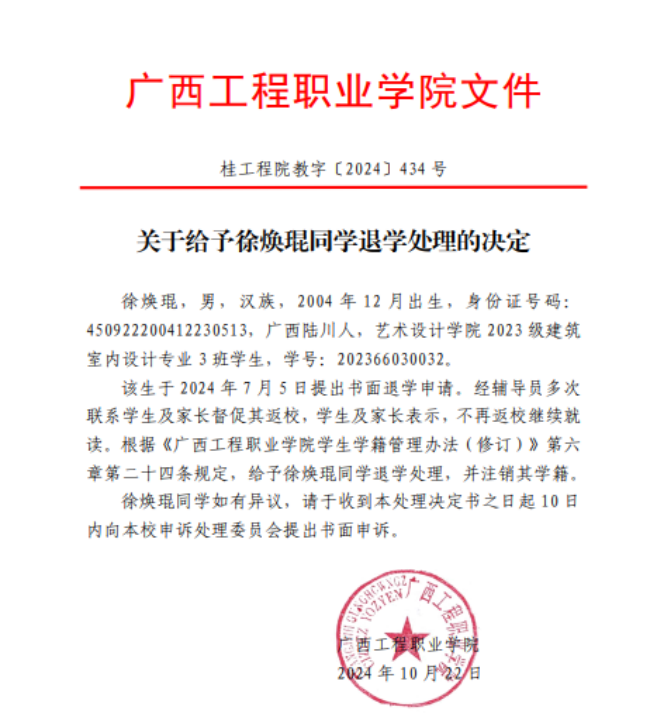 根據(jù)《普通高等學(xué)校學(xué)生管理規(guī)定》(教育部令第41號(hào))、《廣西工程職業(yè)學(xué)院學(xué)生學(xué)籍管理辦法(修訂)》第二十四條規(guī)定,給予徐煥琨同學(xué)退學(xué)處理,并注銷其學(xué)籍。