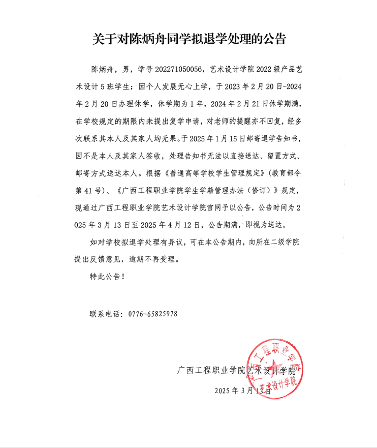 下一篇:關(guān)于對(duì)羅珮妮同學(xué)擬退學(xué)處理的公告