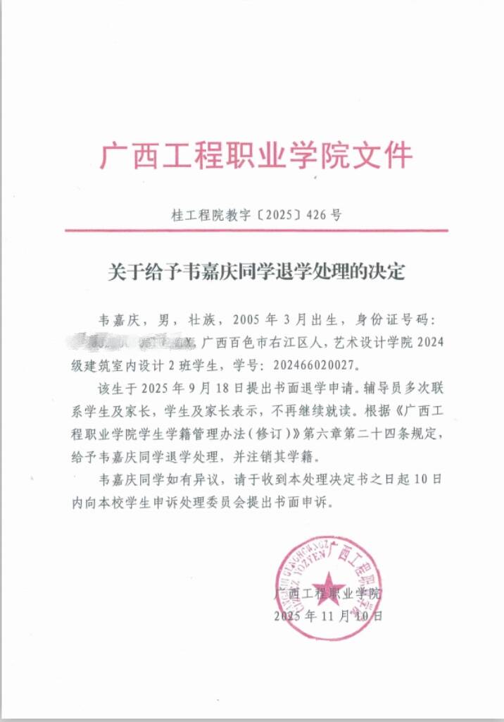 根據(jù)《普通高等學校學生管理規(guī)定》(教育部令第41號)《廣西工程職業(yè)學院學生學籍管理辦法(修訂)》第二十四規(guī)定,給予韋嘉慶同學退學處理,同時注銷其學籍。