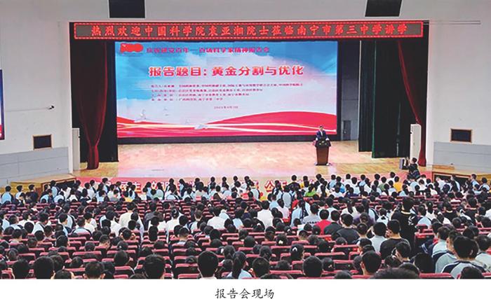 在南寧市第三中學(xué),袁亞湘院士為廣大師生作了題為“黃金分割與優(yōu)化”的科普講座。袁亞湘院士先從國旗的五角星談起,逐漸過渡到了歐幾里得對黃金分割的首次提出,達(dá)芬奇、開普勒、歐姆等人對黃金分割比例計算的不斷探索和發(fā)展,重點(diǎn)介紹了華羅庚根據(jù)黃金分割比例而提出的優(yōu)選法及其推廣、應(yīng)用。隨后,他以一個選取最優(yōu)點(diǎn)的題目為引子,結(jié)合田忌賽馬的故事、歐拉七橋問題,以及日常生活中快遞員如何根據(jù)最短路徑投遞等一系列妙趣橫生卻又耳熟能詳?shù)臍v史著名優(yōu)化例子,介紹了利用黃金分割比例所構(gòu)造的常見的幾種優(yōu)化方法,引出了線性規(guī)劃的概念。他說,任何需要決策的問題都是優(yōu)化問題,優(yōu)化問題最后都會歸結(jié)為算法和數(shù)學(xué)問題。同時,他簡單介紹了力學(xué)、材料科學(xué)、金融、生命科學(xué)、信息科學(xué)、地學(xué)、交通等學(xué)科中的優(yōu)化問題。