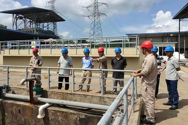 韋國(guó)柱(左二、紅帽)指導(dǎo)污水處理中心技改亮化工程