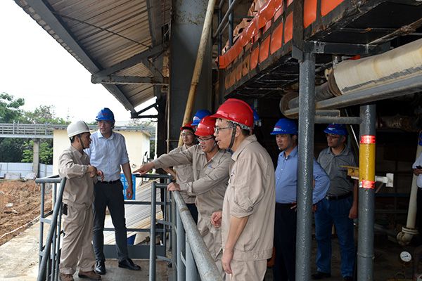 韋國(guó)柱(左四)在技改現(xiàn)場(chǎng)指導(dǎo)環(huán)保設(shè)施建設(shè)