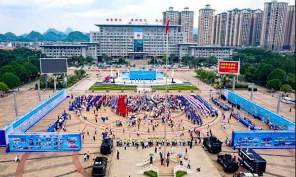 儀式在在平果市文化廣場舉行。百色市委副書記、政法委書記、禁毒委主任黃智宇,百色市人民政府副市長、公安局局長、禁毒委第一副主任羅衛(wèi)東,平果市人民政府市長羅成,平果市委常委、政法委書記謝軍,平果市人民政府副市長、公安局局長周作鐵等領(lǐng)導(dǎo)出席活動(dòng)。