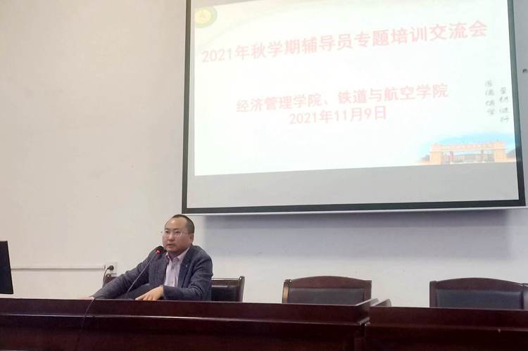 為提升我校思想政治工作質(zhì)量和輔導(dǎo)員隊(duì)伍建設(shè)水平,培養(yǎng)輔導(dǎo)員隊(duì)伍的職業(yè)榮譽(yù)感與歸屬感,增強(qiáng)輔導(dǎo)員的團(tuán)隊(duì)協(xié)作意識(shí),推動(dòng)輔導(dǎo)員隊(duì)伍專業(yè)化、職業(yè)化發(fā)展,11月9日下午,經(jīng)濟(jì)管理學(xué)院、鐵道與航空管理學(xué)院在圖書館學(xué)術(shù)報(bào)告廳聯(lián)合召開(kāi)2021年秋學(xué)期輔導(dǎo)員專題培訓(xùn)交流會(huì),學(xué)校黨委委員、副校長(zhǎng)彭高彬參與并指導(dǎo)此次交流會(huì),兩個(gè)二級(jí)學(xué)院的黨支部書記、分團(tuán)委書記、全體輔導(dǎo)員參加交流會(huì)。
