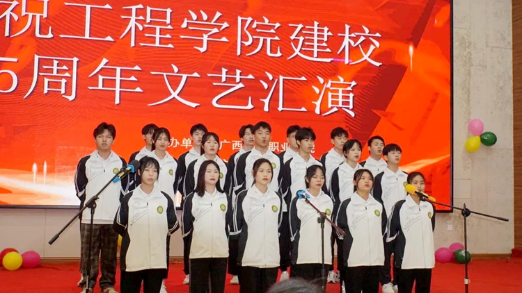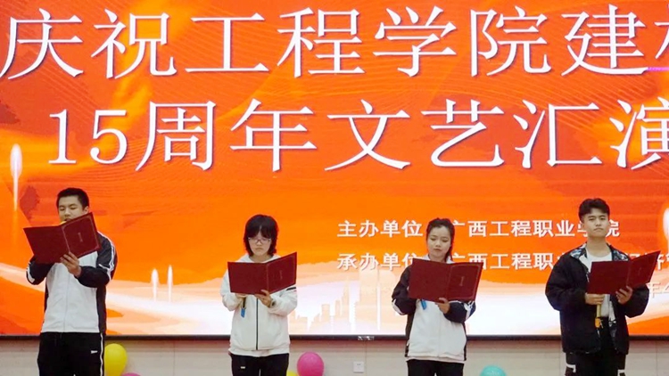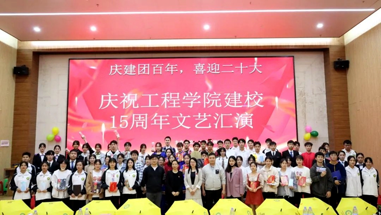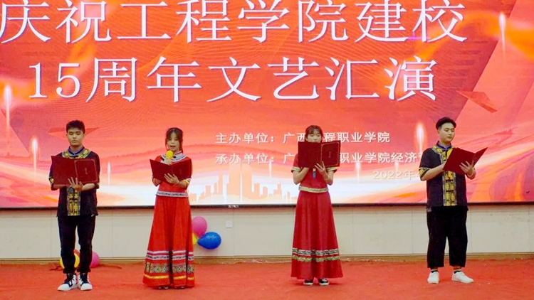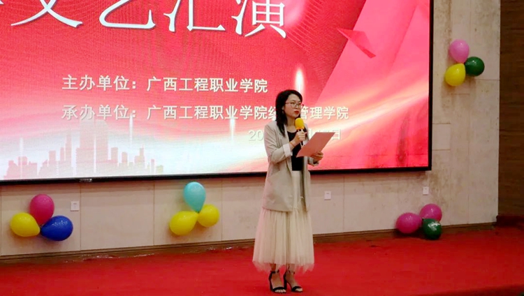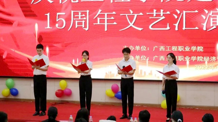 經(jīng)濟(jì)管理學(xué)院院長龐英連宣布晚會開始后,精彩的節(jié)目逐一上演,同學(xué)們以深情的朗誦、優(yōu)美的舞蹈,動聽的歌聲慶祝廣西工程職業(yè)學(xué)院建校十五周年,喜迎二十大,獻(xiàn)禮建團(tuán)一百周年。