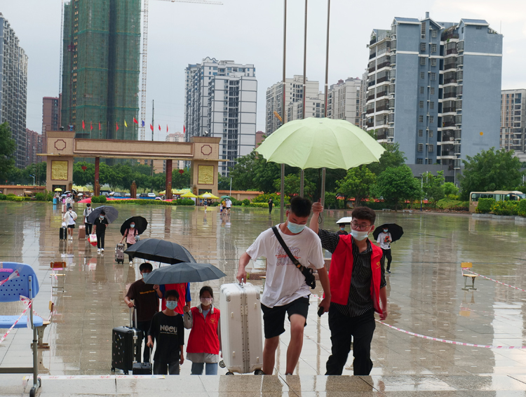志愿者雨中護(hù)送返校老生到核酸檢測(cè)區(qū)