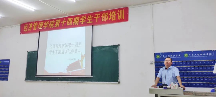 經(jīng)濟管理學(xué)院第十四期班干部培訓(xùn)班結(jié)業(yè)典禮于2023年10月24日晚舉行。校紀委書記、副校長彭高彬,經(jīng)濟管理學(xué)院黨支部書記、院長龐英連,經(jīng)濟管理學(xué)院黨支部副書記潘翠萍,經(jīng)濟管理學(xué)院辦公室主任雷紅,經(jīng)濟管理學(xué)院工商教研室主任劉忠略,經(jīng)濟管理學(xué)院財會教研室主任石娜,莫清妮老師等出席結(jié)業(yè)典禮儀式。儀式由黃丹同學(xué)主持。