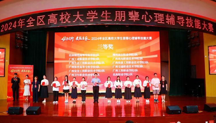 5月25—26日,由自治區(qū)教育廳主辦的2024年全區(qū)高校大學(xué)生朋輩心理輔導(dǎo)技能大賽決賽在廣西財(cái)經(jīng)學(xué)院相思湖校區(qū)舉行。我校參賽隊(duì)伍(隊(duì)員:張曼、胡成超、黃敏;指導(dǎo)老師:黃秋霞、李麗詩(shī)、凌艷婷)在決賽中表現(xiàn)優(yōu)異,榮獲三等獎(jiǎng)。