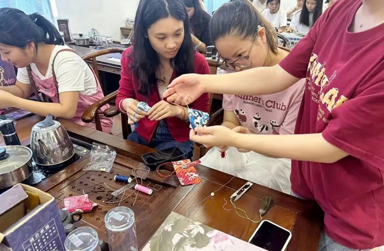 在手鏈制作區(qū)域,五彩絲線、精美珠子等材料整齊擺放。同學(xué)們充分發(fā)揮創(chuàng)意,將象征吉祥如意的五彩絲線與珠子巧妙搭配,編織出一條條獨(dú)具個(gè)性的端午手鏈。大家相互交流編織技巧,歡聲笑語(yǔ)不斷。