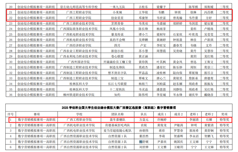 6月27日—28日,2025年第十二屆“學(xué)創(chuàng)杯”全國大學(xué)生創(chuàng)業(yè)綜合模擬大賽廣西賽區(qū)選拔賽(職教組)在柳州職業(yè)技術(shù)大學(xué)舉行。本次選拔賽共有32所高校、500余師生參與競賽。我校經(jīng)濟管理學(xué)院石娜和徐春陸,鐵道與航空學(xué)院徐琳和韋丹蕾共4位老師帶領(lǐng)2023級大數(shù)據(jù)與會計專業(yè)黃菲、2023級電子商務(wù)專業(yè)鄭誠、2023級城市軌道交通工程技術(shù)專業(yè)方益元、2023級學(xué)前教育專業(yè)許婉婷等26名同學(xué)參加此次比賽,通過不懈努力,我校學(xué)子榮獲
