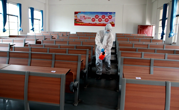 在教室演練現(xiàn)場,通往教學(xué)樓的臺階上張貼了顯眼的路線標(biāo)識,學(xué)生按指定路線排隊體溫檢測、進(jìn)入教學(xué)樓。學(xué)生必須佩戴口罩、進(jìn)行手部消毒后才能進(jìn)入教室。教室內(nèi),學(xué)生保持距離、分散就座。上課前,過道及講臺等要完成消毒,輔導(dǎo)員要組織學(xué)生進(jìn)行體溫復(fù)測,并對每位學(xué)生進(jìn)行登記;教學(xué)樓始終保持教室通風(fēng)、對每個廁所定時消毒等。如發(fā)現(xiàn)學(xué)生體溫異常輔導(dǎo)員立即聯(lián)系校醫(yī),將發(fā)燒學(xué)生安排到學(xué)校隔離室,其他學(xué)生進(jìn)入備用教室,對原教室進(jìn)行全面消毒。