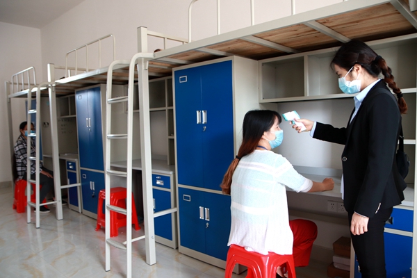 在在入住宿舍演練環(huán)節(jié),學(xué)生按照規(guī)定入住宿舍后不再隨意出宿舍。宿管員定時為宿舍區(qū)每位同學(xué)進(jìn)行測溫,發(fā)現(xiàn)體溫異常則進(jìn)行系列處置。