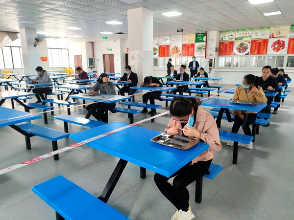 學(xué)校多功能餐廳外,“七步洗手法”宣傳標(biāo)識十分醒目,就餐學(xué)生首先需在洗手池進(jìn)行手部消毒,隨后,就餐學(xué)生按照工作人員要求掃碼、測溫、腳踩消毒毯消毒進(jìn)入食堂,按引導(dǎo)標(biāo)線到取餐區(qū)取餐,取餐后選擇相應(yīng)分散位置落座就餐。據(jù)悉,學(xué)校食堂實(shí)行單人單桌就餐,全體學(xué)生錯時就餐,就餐后間隔一米離開餐廳。