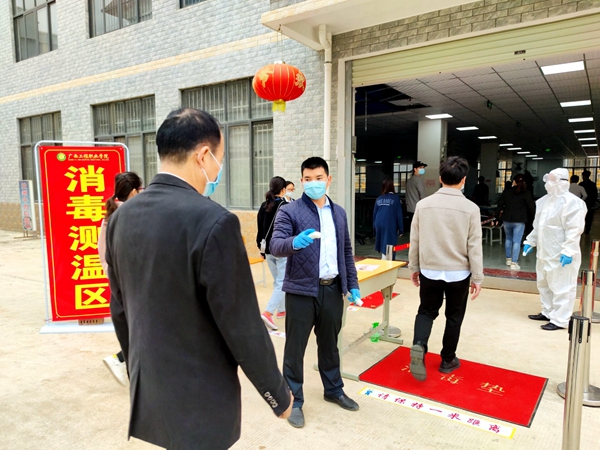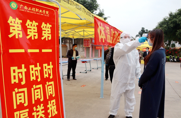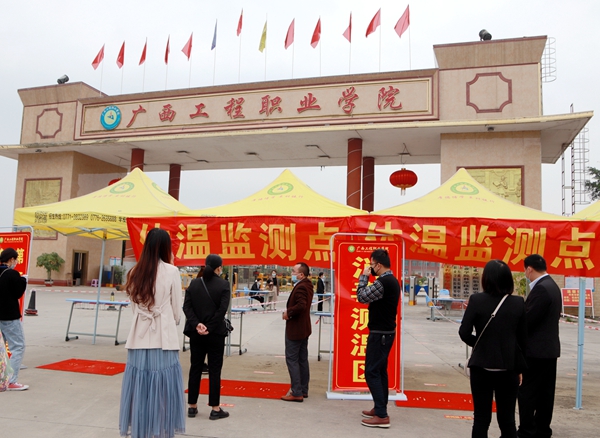 4月16日上午,廣西工程職業(yè)學(xué)院校門口非同一般,醒目的疫情防控紅色隔離帶將道路一分為四,每條通道擺放消毒地毯,幾十余名“學(xué)生”一米間隔排隊、井然有序,執(zhí)勤工作人員在對應(yīng)卡點(diǎn)上各司其責(zé),行李物品消毒處理、體溫監(jiān)測、體溫異常處置等各項防控工作有條不紊,嚴(yán)謹(jǐn)細(xì)致,經(jīng)過層層關(guān)卡,通過所有檢查的學(xué)生方可進(jìn)入校園。