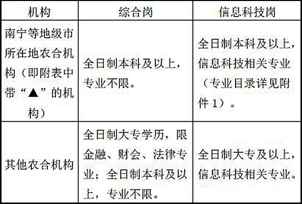(四)學(xué)歷為全日制大專的廣西建檔立卡貧困戶子女,報(bào)考本縣農(nóng)合機(jī)構(gòu)綜合崗、信息科技崗可放寬專業(yè);報(bào)考南寧等14個(gè)地級(jí)市所在地的農(nóng)合機(jī)構(gòu),以及邕寧、臨桂的農(nóng)合機(jī)構(gòu),不在放寬范圍。