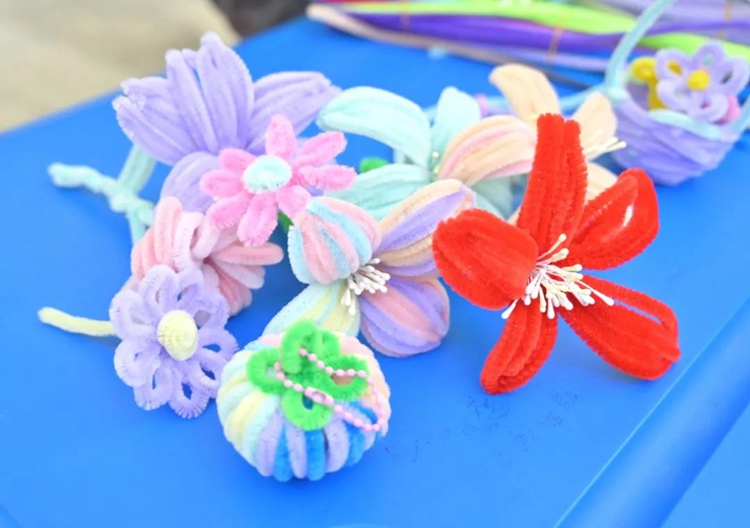 同學(xué)們圍坐一起,手中拿著扭扭棒,她們認(rèn)真地折疊、扭動,每一步都充滿了對美的追求和對節(jié)日的慶祝。