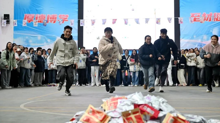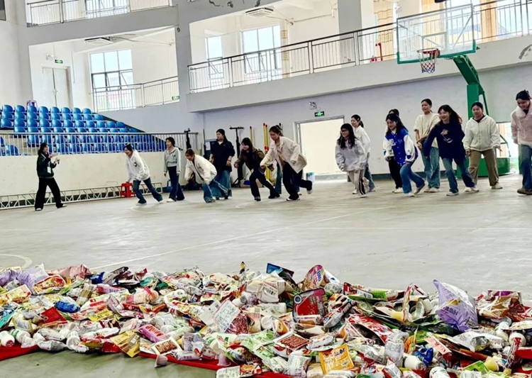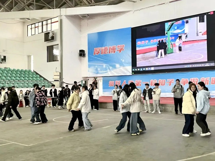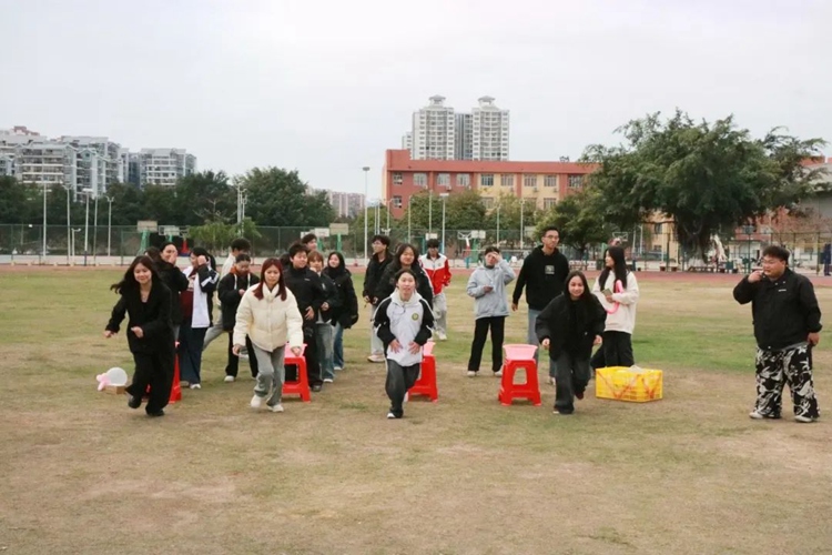 “接力套圈”游戲,每個班派出10個人組成一隊(duì),兩位選手在起點(diǎn)面對面用身體撐著套圈走到終點(diǎn),再從終點(diǎn)以過山洞的方式回到起點(diǎn),用時最短的前七名獲得零食大禮包。