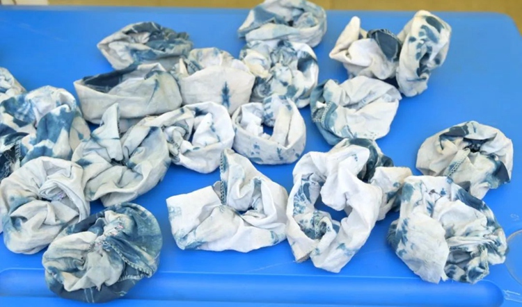 活動現(xiàn)場,同學(xué)們圍坐在一起,互相交流、幫助,共同完成扎染作品。