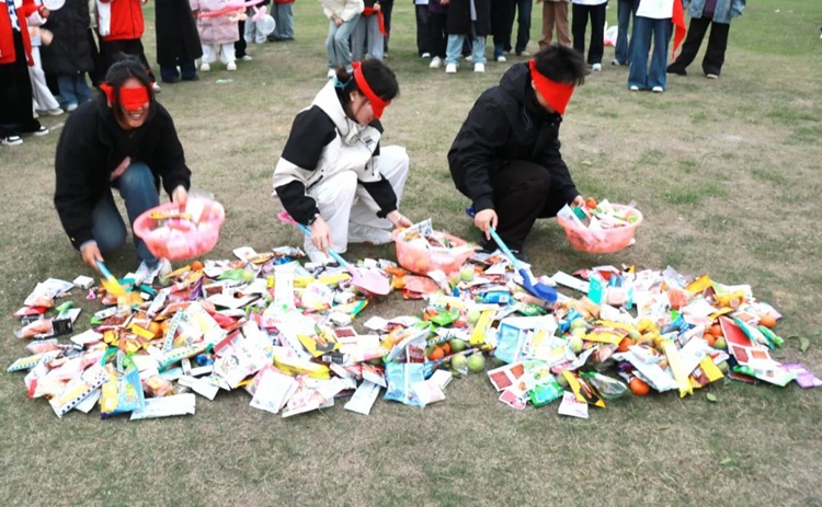 零食很“鏟”環(huán)節(jié),同學(xué)們蒙住眼睛原地轉(zhuǎn)5圈后在30秒時間內(nèi)不限次數(shù)用鏟子把零食挑到盤里。同學(xué)們積極參與其中,游戲環(huán)節(jié)促進(jìn)了同學(xué)們相互交流,彼此留下了許多歡聲笑語的回憶。