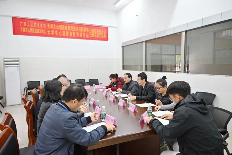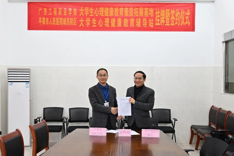 為進一步強化學(xué)校學(xué)生心理健康服務(wù)體系建設(shè),深化校醫(yī)協(xié)同育人機制,充分發(fā)揮“心理育人”功能,更好地為大學(xué)生的心理健康“保駕護航”,2025年3月17日下午,學(xué)校與平果市人民醫(yī)院城東院區(qū)舉行“大學(xué)生心理健康教育素質(zhì)拓展基地”“大學(xué)生心理健康教育輔導(dǎo)站”共建簽約揭牌儀式。