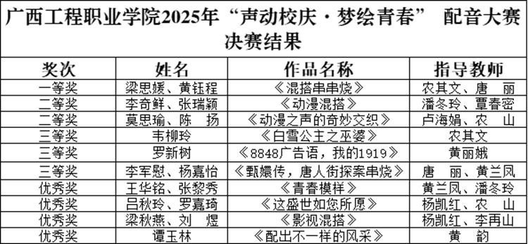 本次“聲動(dòng)校慶·夢(mèng)繪青春”配音大賽,為學(xué)生們提供了一個(gè)展示自我、鍛煉能力的平臺(tái)。這場(chǎng)視聽(tīng)盛宴不僅讓廣工程院學(xué)子在聚光燈下綻放個(gè)性光彩,更以聲音為媒介,編織出對(duì)學(xué)校十八載崢嶸歲月的深情禮贊,為校慶畫(huà)卷添上了充滿(mǎn)青春力量的絢麗注腳。