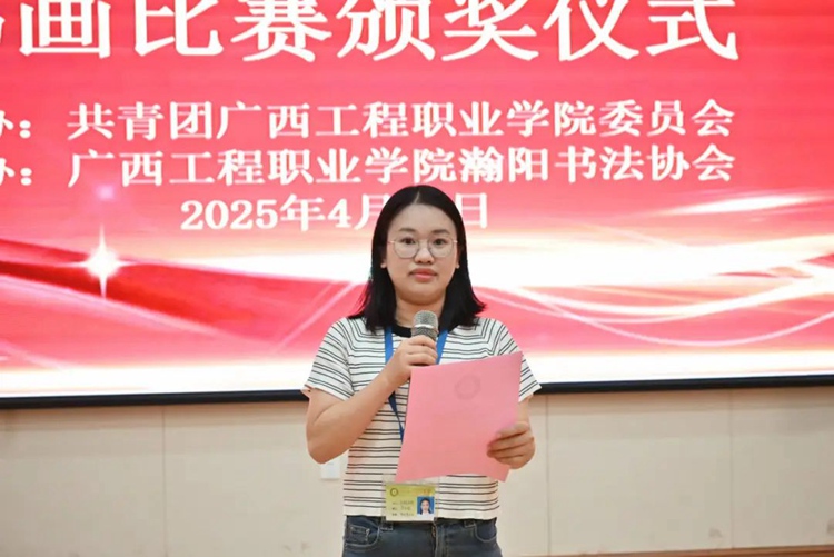 副校長黃德偉致辭,他指出,學(xué)校從建校之初到如今的桃李芬芳,始終秉承“厚德博學(xué),至材健行”的校訓(xùn)精神,在傳承中創(chuàng)新,在耕耘中收獲。此次校慶書畫比賽的成功舉辦,既是對(duì)學(xué)校十八年風(fēng)雨歷程的深情禮贊,又展現(xiàn)了同學(xué)們的藝術(shù)才華和精神風(fēng)貌。他鼓勵(lì)同學(xué)們通過藝術(shù)鑒賞與創(chuàng)作不斷提升個(gè)人文化修養(yǎng)、美育素養(yǎng),積極參與校園文化建設(shè),共同書寫廣西工程職業(yè)學(xué)院新篇章。