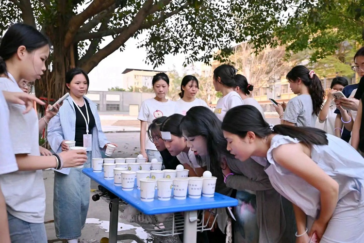 選手們屏氣凝神,對(duì)著漂浮在水杯上的乒乓球奮力吹氣,有的掌握技巧,一氣呵成完成挑戰(zhàn),有的因用力過猛濺起水花引得現(xiàn)場(chǎng)笑聲連連。