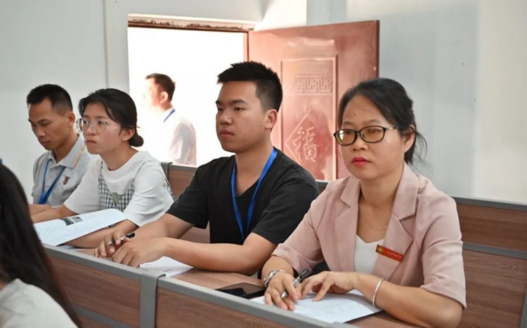 圖為學(xué)校黨委書記、督導(dǎo)專員蒙本曼認真聆聽