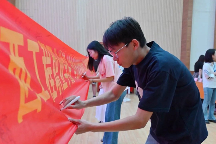 儀式現(xiàn)場(chǎng),同學(xué)們紛紛拿起筆,在橫幅上留下自己的名字,莊嚴(yán)承諾會(huì)把資助關(guān)懷轉(zhuǎn)化為求知熱情,以拼搏進(jìn)取的姿態(tài)回報(bào)國家的殷切期望。