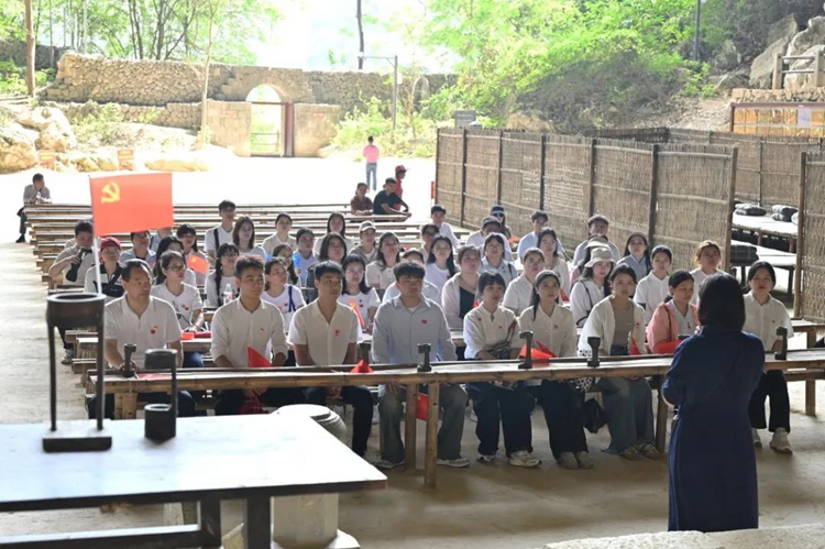 在列寧巖里,講解員向大家詳細講解了韋拔群同志在列寧巖中傳播革命思想、培育革命干部、加強革命作風(fēng)的光輝歷史,一排排整齊的課桌椅,一張張對稱的學(xué)員床……正是他們追求革命理想的最好見證。