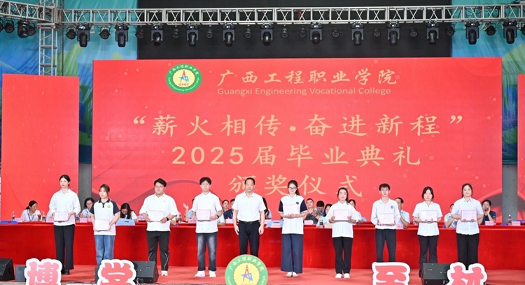 圖為黨委副書記、校長(zhǎng)羅艷妮為被評(píng)為廣西工程職業(yè)學(xué)院2025屆優(yōu)秀畢業(yè)生的學(xué)生代表頒獎(jiǎng)