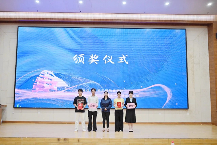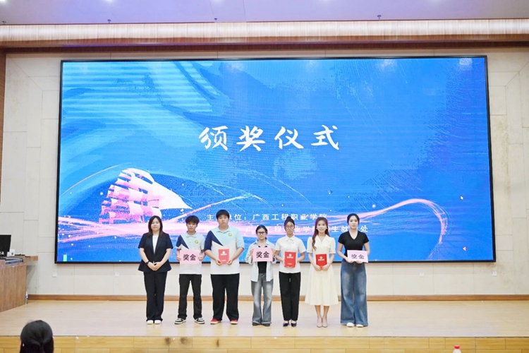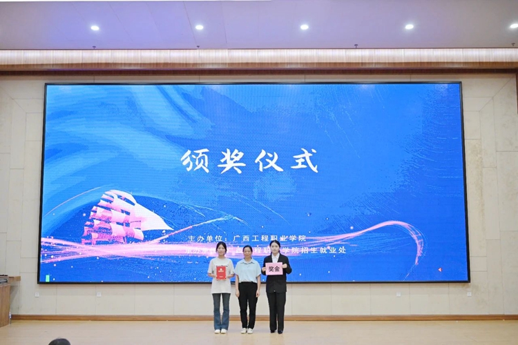 圖為廣西工程職業(yè)學(xué)院招生就業(yè)處副處長陳麗燕為學(xué)生頒發(fā)二等獎