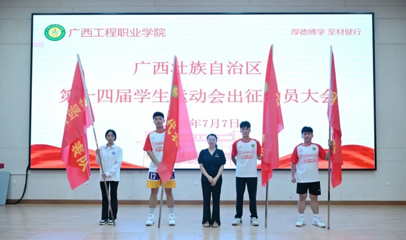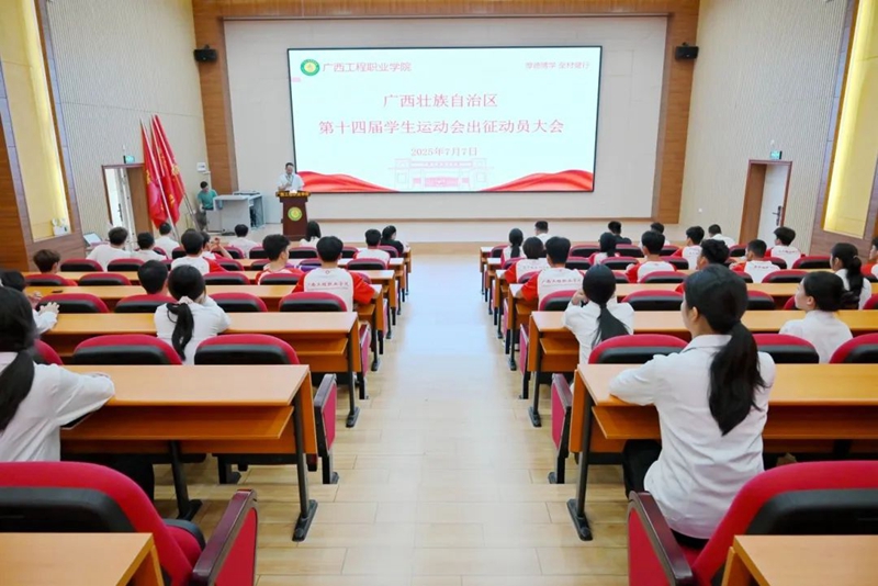 2025年7月7日,廣西壯族自治區(qū)第十四屆學(xué)生運動會廣西工程職業(yè)學(xué)院代表團出征動員大會在圖文信息大樓五樓學(xué)術(shù)報告廳舉行。大會旨在為即將出征的運動員們鼓舞士氣、凝聚力量。
