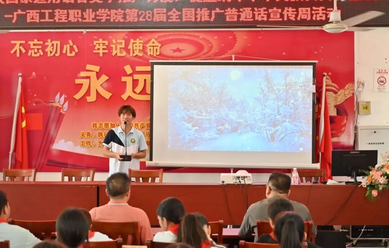 廣西工程職業(yè)學(xué)院學(xué)生代表李奇鮮、莫代總還帶來了精彩的朗誦表演。兩人身著整齊服裝,精神飽滿地站上舞臺,以標(biāo)準(zhǔn)流利的普通話朗誦經(jīng)典篇目,語調(diào)時而激昂、時而舒緩,聲情并茂的演繹極具感染力,臺下不時響起陣陣熱烈掌聲。
