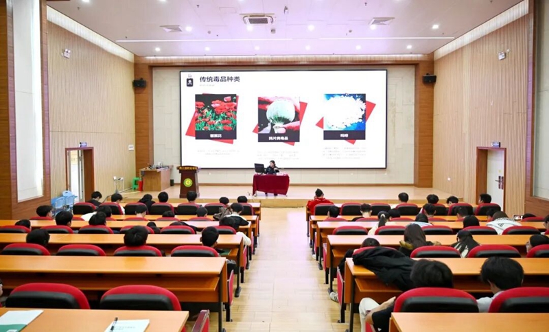 黃雪嬌警官通過圖片的形式向同學(xué)們展示了新型毒品的主要種類以及制作毒品的原材料,同時以視頻的形式展現(xiàn)了吸毒對社會治安造成的嚴(yán)重危害。深入淺出地向同學(xué)們介紹了吸毒給身心健康帶來的嚴(yán)重影響,以及販毒所承受的刑事責(zé)任。她強調(diào),無論是吸毒還是販毒都是我們大學(xué)生不可觸碰的“紅線”,同時需要警惕身邊存在的吸毒販毒等行為,提高自己的防范意識。