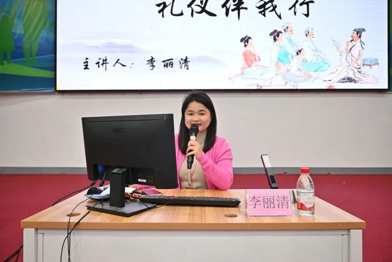 圖為團(tuán)委副書記李麗清作《文明禮儀伴我行》專題教育