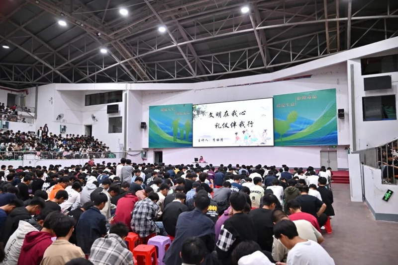 圖為學(xué)生工作處科長梁義平作《文明禮儀伴我行》專題教育