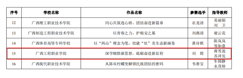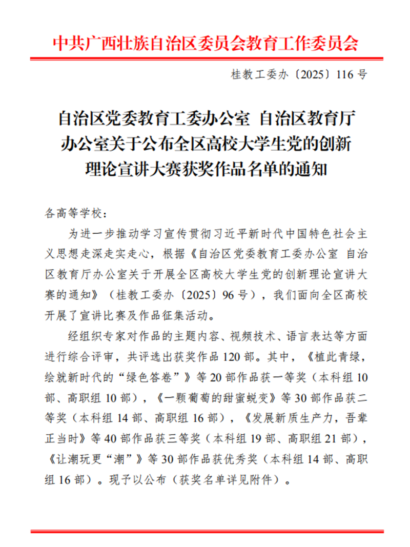 近日,自治區(qū)黨委教育工委辦公室、自治區(qū)教育廳辦公室聯(lián)合印發(fā)《關(guān)于公布全區(qū)高校大學(xué)生黨的創(chuàng)新理論宣講大賽獲獎作品名單的通知》(桂教工委辦〔2025〕116 號),我校學(xué)子在此次大賽中喜獲殊榮!