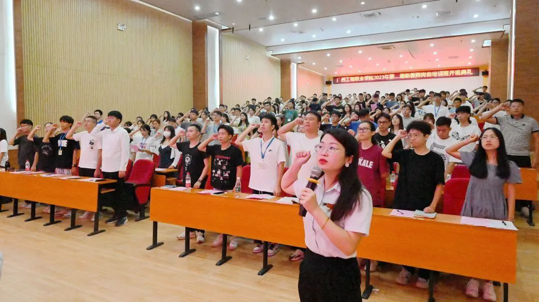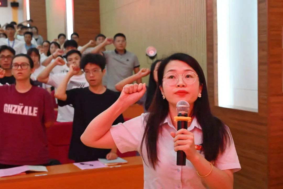 開班典禮上,為增強新任教師的榮譽感和使命感,黃秋霞副書記帶領(lǐng)新入職教師進行了入職宣誓。全體新任教師整齊肅立,右手舉拳,面向國旗,進行了莊嚴的入職宣誓。