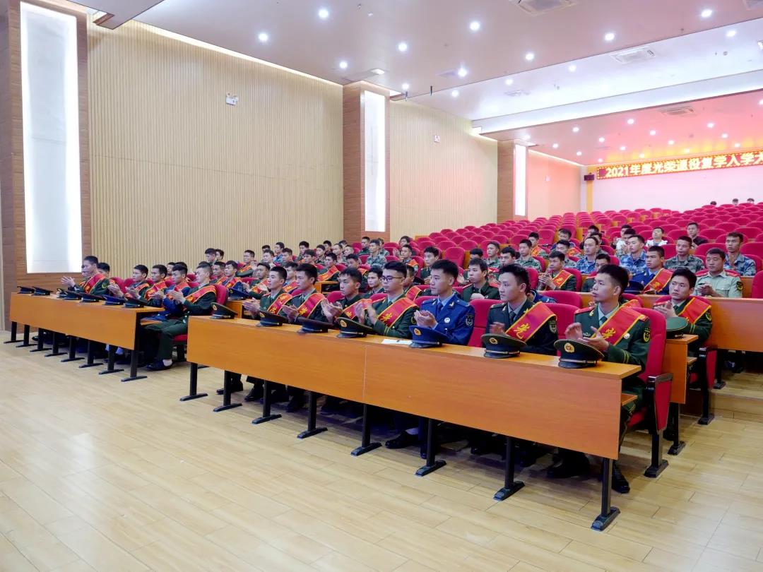 儀式結(jié)束,學(xué)校副校長黃德偉副教授,校長助理黃秋霞及相關(guān)與會(huì)領(lǐng)導(dǎo)和退役復(fù)學(xué)入學(xué)同學(xué)合影留念。
