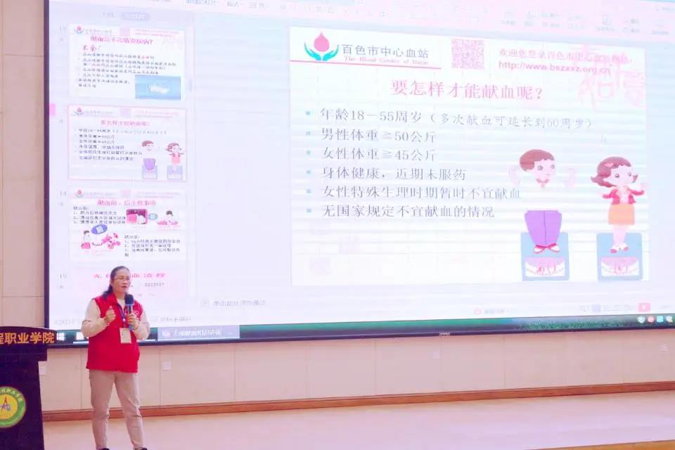 百色市中心血站韋麗丹老師通過PPT圖文并茂地給大家介紹了血液常識、獻(xiàn)血前后注意事項(xiàng)、獻(xiàn)血流程、相關(guān)法律法規(guī)等。講座中她還對無償獻(xiàn)血認(rèn)識中存在的誤區(qū)及學(xué)生關(guān)注的問題進(jìn)行了具體闡述與分析,讓同學(xué)們對無償獻(xiàn)血有了更深刻的認(rèn)識。