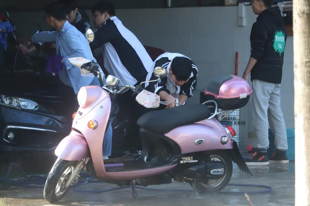 現(xiàn)場的學(xué)生志愿者們在老師的指引下分工明確,從接待、噴水、噴灑泡沫、沖洗、擦干到交車,大家熱情高漲,每個環(huán)節(jié)都有條不紊地進(jìn)行著,同學(xué)們以勞動為榮,樂在其中,力爭為老師們提供優(yōu)質(zhì)又專業(yè)的暖心服務(wù)。