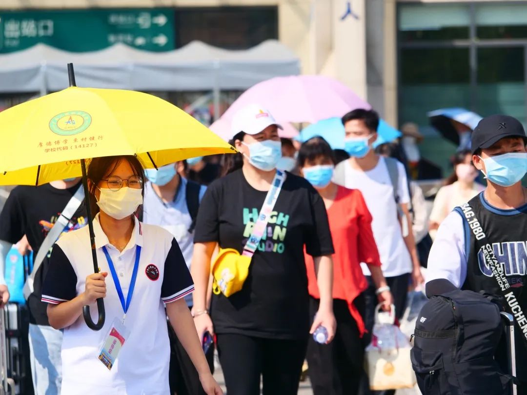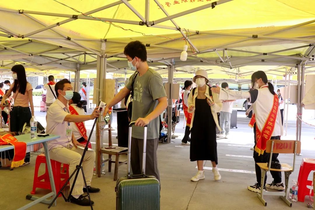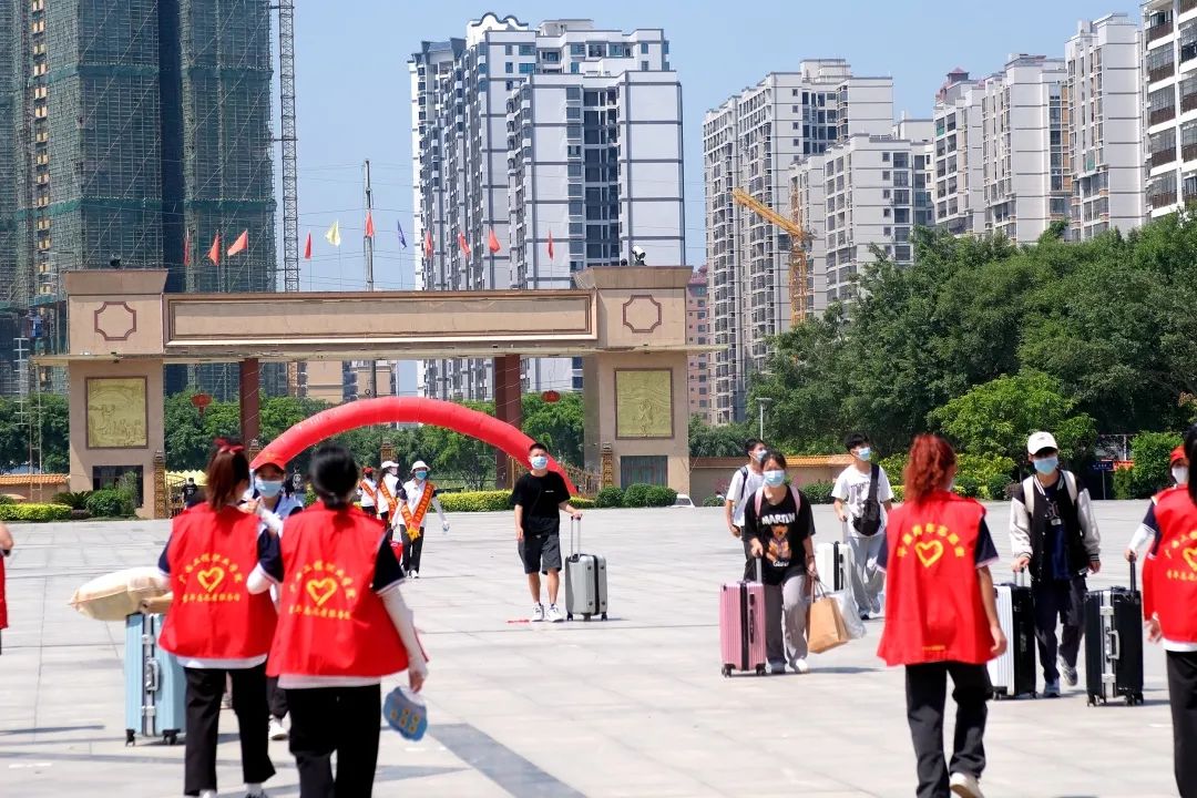 志愿者在火車站出站口引領(lǐng)新生及其家長(zhǎng)到接待處